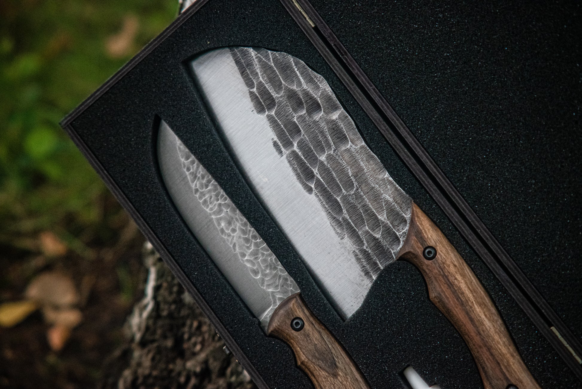 Gift box of handmade knives "Serbian" and "Mountain Heart" with stone texture was crafted with mastery and love by our workshop "Monterro". Hunting knife "Mountain Heart" is perfectly suited for outdoor camping, cooking, and will become your trusty go-to companion in all adventures. The kitchen cleaver "Serbian" was crafted to excel as both a kitchen hatchet and a knife. This model effortlessly tackles bones with the precision of a hatchet and slices through meat with the finesse of a knife.