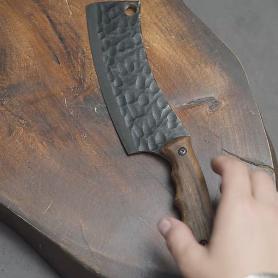 Handmade Cleaver "Crescent" with stone texture was made with mastery and love by our workshop "Monterro". It's perfect for BBQ, cooking at home and outdoor. Crafted to excel as both a kitchen hatchet and a knife, this model effortlessly tackles bones with the precision of a hatchet and slices through meat with the finesse of a knife. Ideal for both personal use and gifting. Whether he's a pro chef, or just loves to grill, this bad boy will become his go-to for slicing and dicing like a boss. Cook like a proffesional wherever you are.