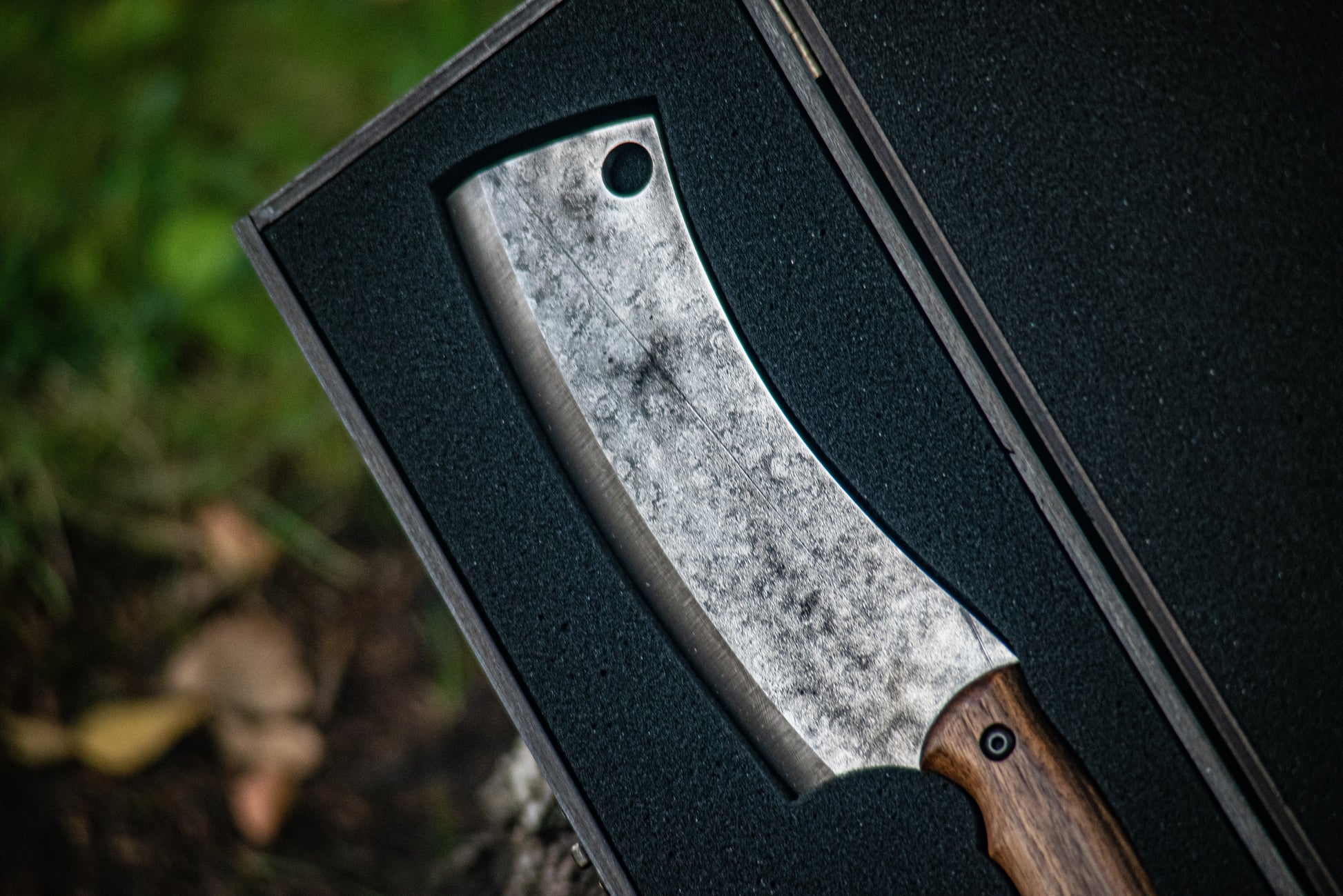 Gift box of handmade kitchen meat cleaver "Crescent" is made with skill and love by our workshop "Monterro". The kitchen cleaver "Crescent" is crafted to excel as both a kitchen hatchet and a knife, this model effortlessly tackles bones with the precision of a hatchet and slices through meat with the finesse of a knife.