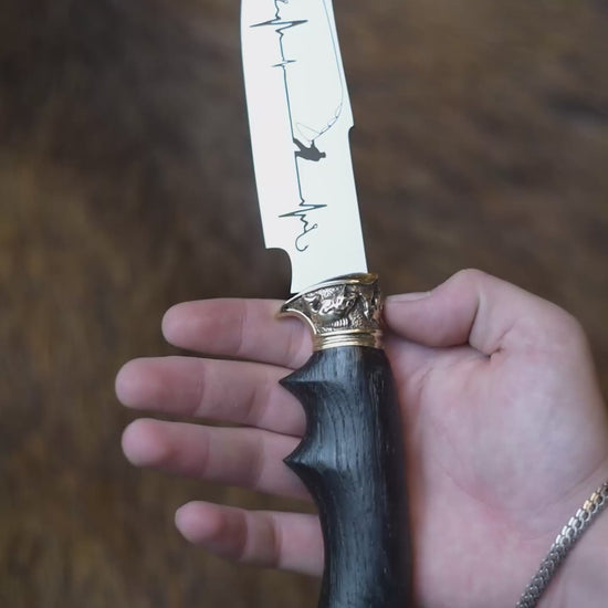 Handmade utility fishing Knife "Fisher" with maple burl handle knife and decorative engraving was crafted with mastery and love by our workshop "Monterro". This hunting knife is perfectly suited for fishing, outdoor camping, bbq, cooking, and will become your trusty go-to companion in all adventures.