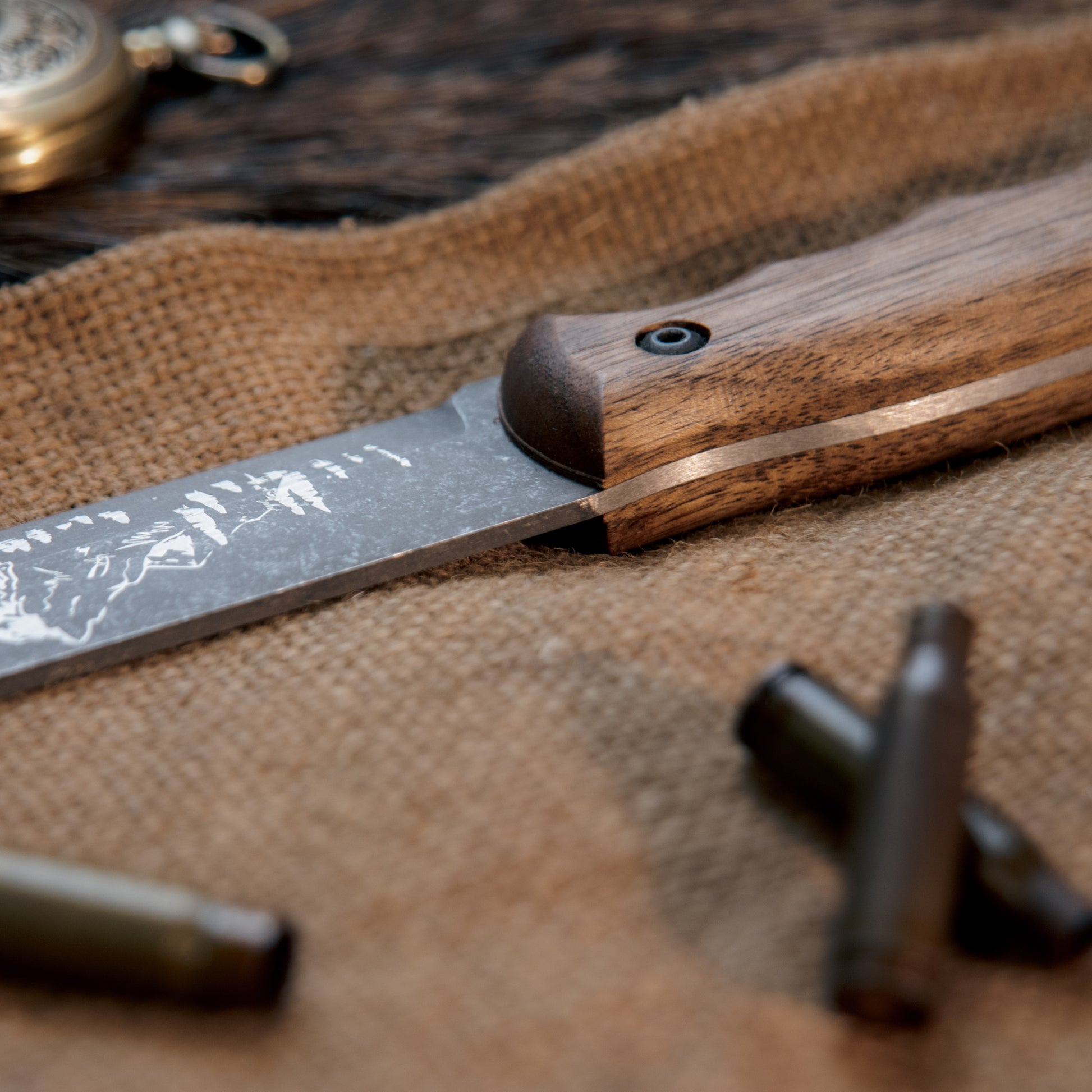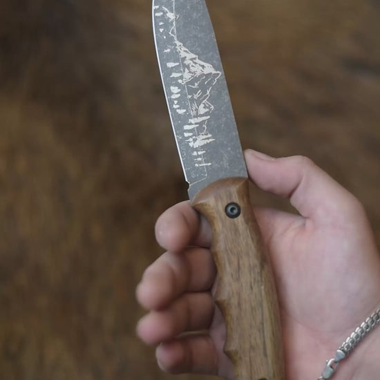 Handmade Bushcraft Knife "Mountain" with an engraving of mountains and a matte blade texture was crafted with mastery and love by our workshop "Monterro". This hunting knife is perfectly suited for outdoor camping, cooking, and will become your trusty go-to companion in all adventures.