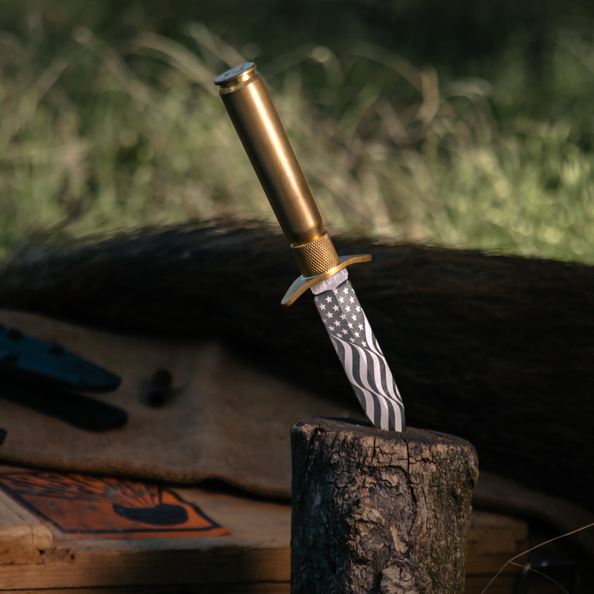 •The handmade Bushcraft Knife "Shell casing Patriot" with an engraving of the American flag.