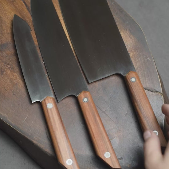Handmade kitchen Japanese Chef knives gift set "Trio" was made with mastery and love by our workshop "Monterro". Ideal utility kitchen knives for slicing, home and professional cooking.